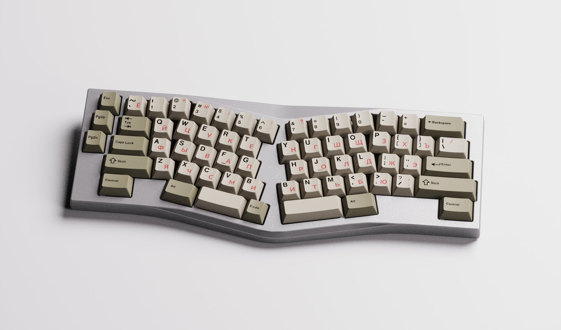 This doubleshot ABS keycap set manufactured by Keykobo features red pad printed Cyrillic sublegends. Inspired by vintage Cherry keyboards, this beige set works well on tons of keyboards and is a staple in many keycap collections.