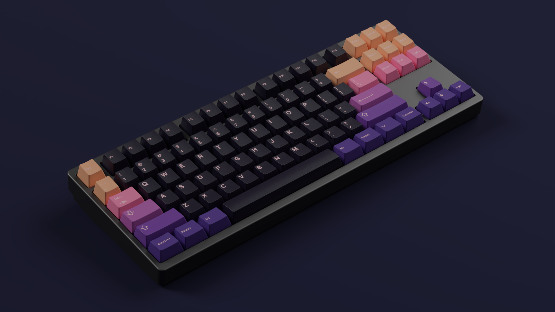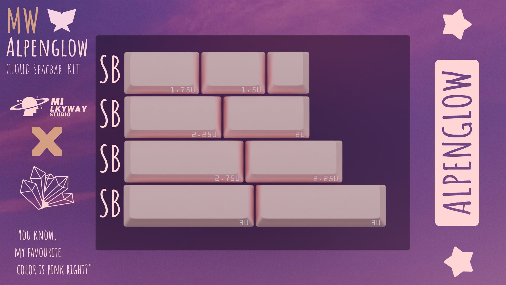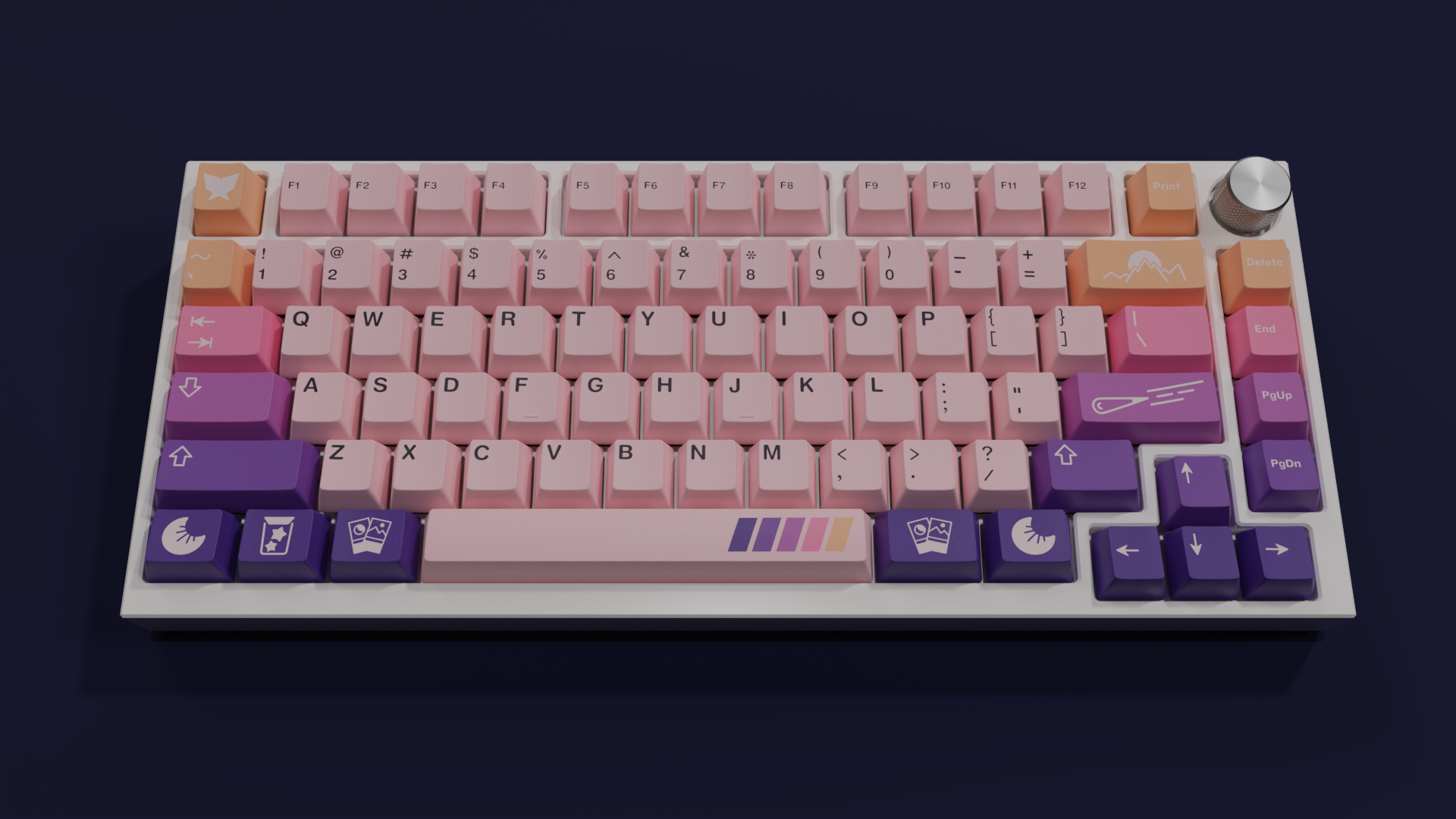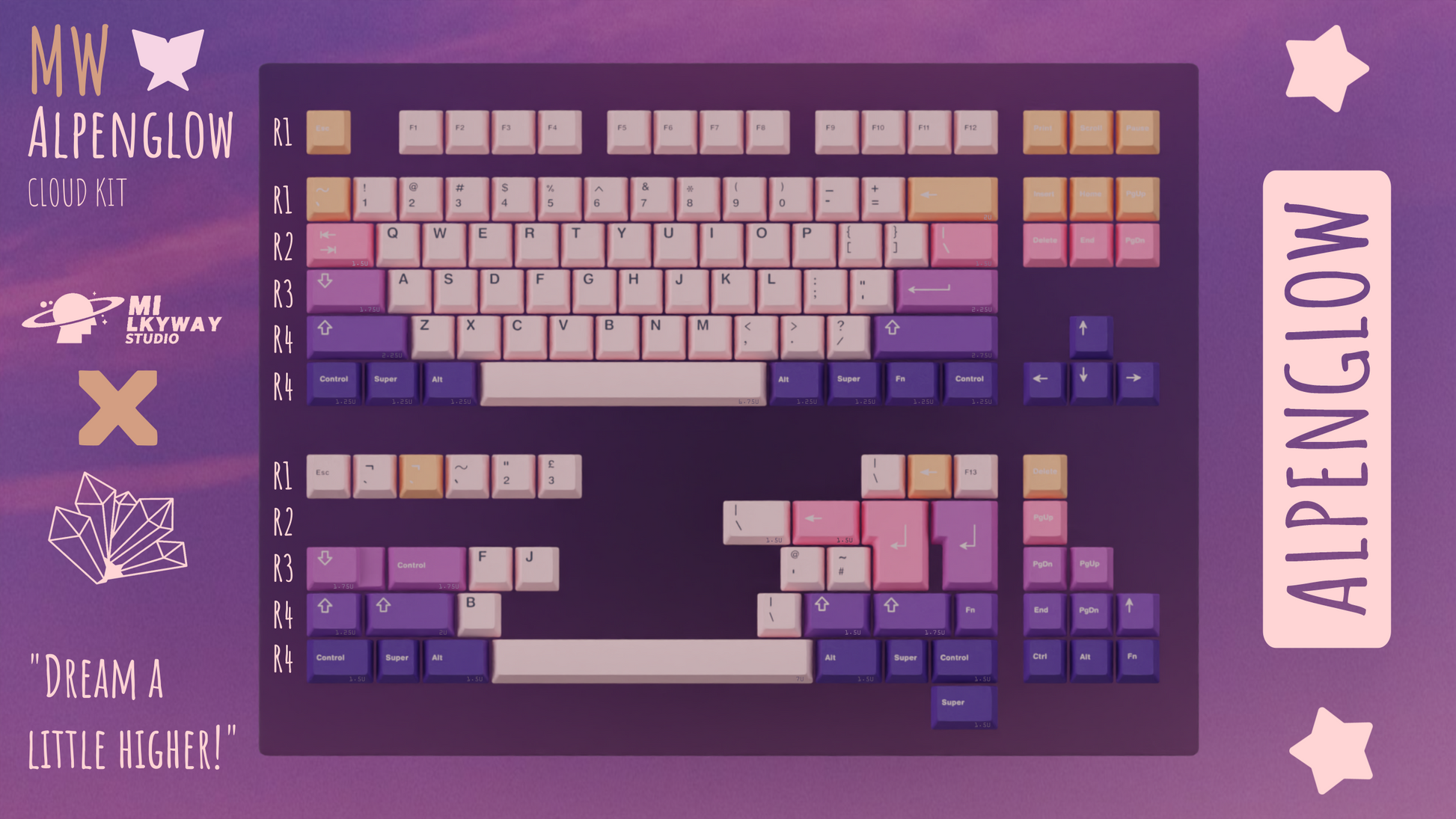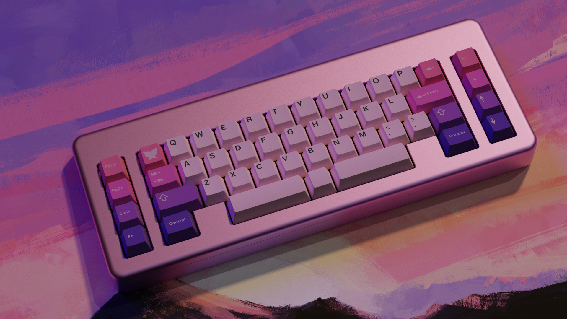 Inspired by the setting sun while on a camping trip, Alpenglow perfectly captures the beauty of a perfect sunset. MW Alpenglow features dye-sublimated PBT keycaps in the Cherry profile, with a gorgeous pink base color and a stunning sunset gradient on the modifiers.