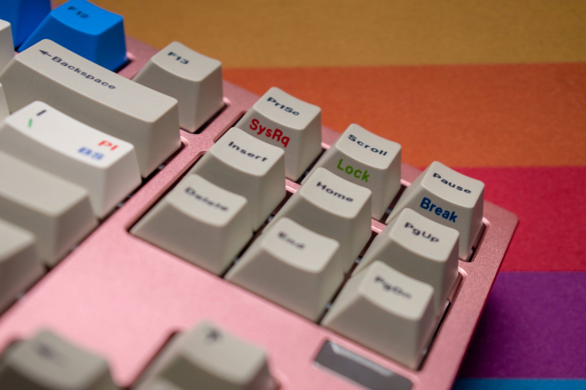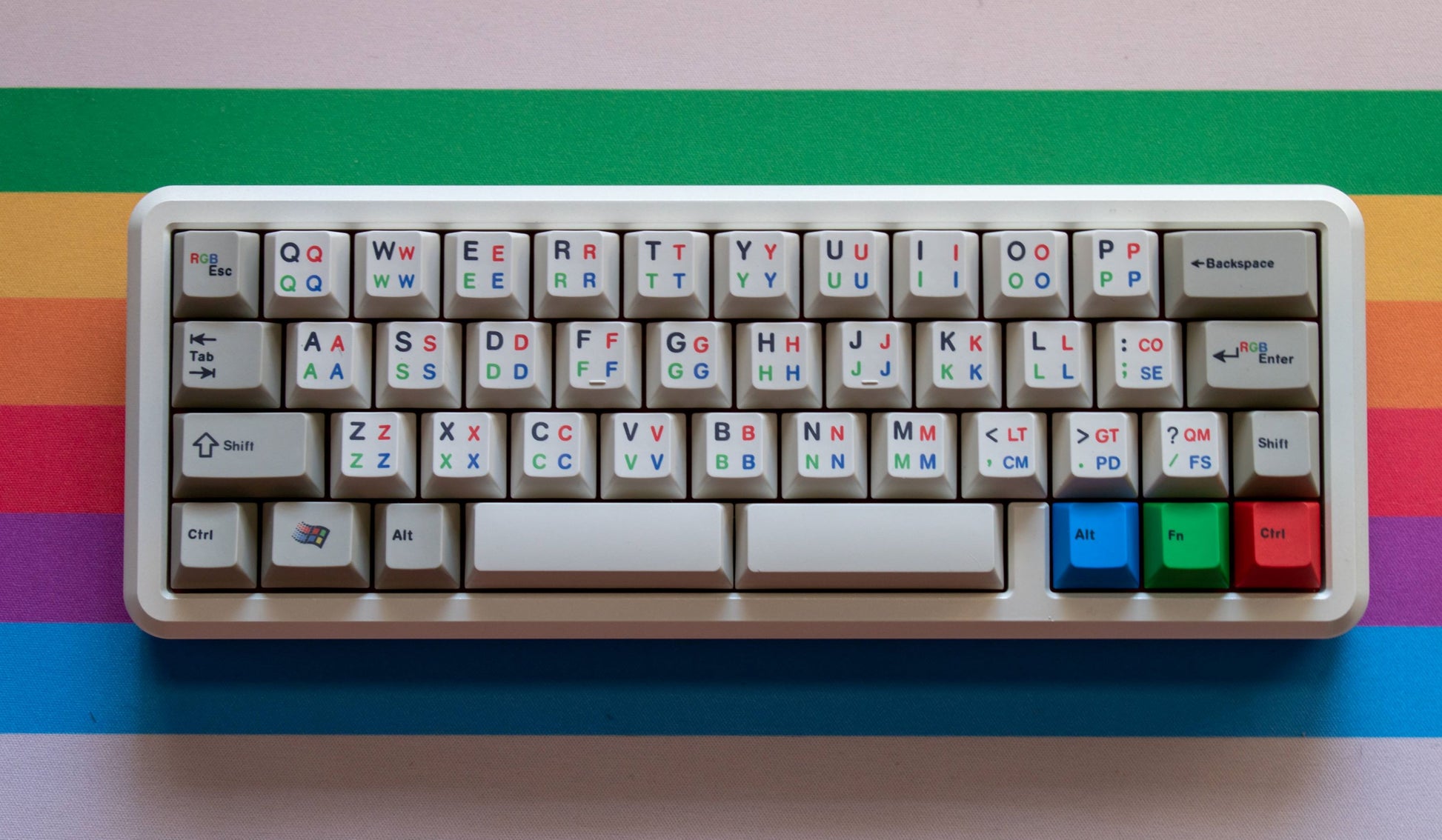 RGBEnglish is a fun set inspired by multiple-character language sets that'll help you type our wonderful latin letters better. It features bright colors, beige, and a wild numpad. PKaps is a new manufacturer that went through three rounds of protos to ensure this set got the justice it deserved. We wanted to provide a massive base kit that would cover ortho and lots of 40s and all the big keyboards, and include a fun frow and extra rgb modifier kit.